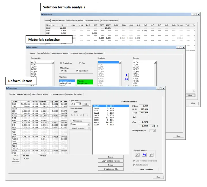 Reformulation tool finds, by means of an implemented calculation algorithm, the recipe that produces a specified oxides composition at minimum cost or other selected value. Enter the desired oxides composition, select the raw materials and/or frits that you want to allow into the recipe. Set the conditions to the recipe. Finally, launch the calculation process.