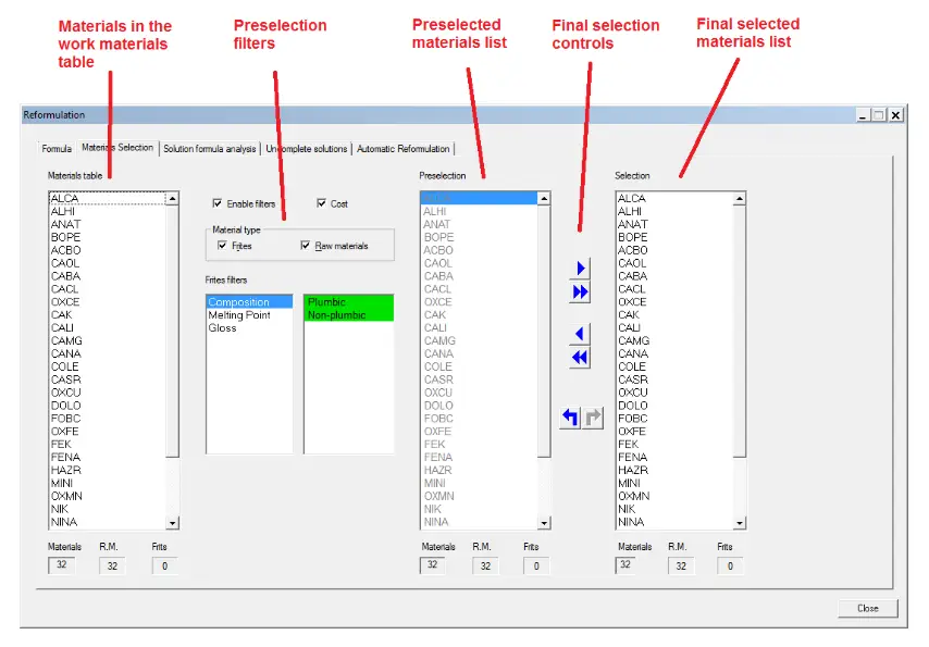 Nelle conversioni di ricetta in ossidi e nello strumento riformulazione l’applicazione lavorerà con la lista d’ossidi della tabella di materiali scelta.