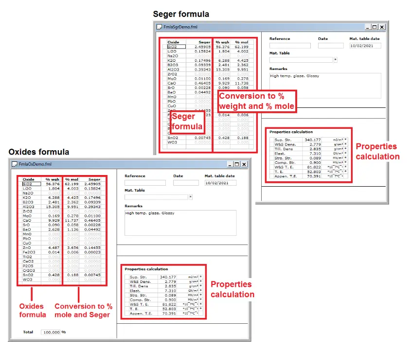 I file formula in ossidi possono contenere una composizione espressa in percentuale peso oppure valori Seger.